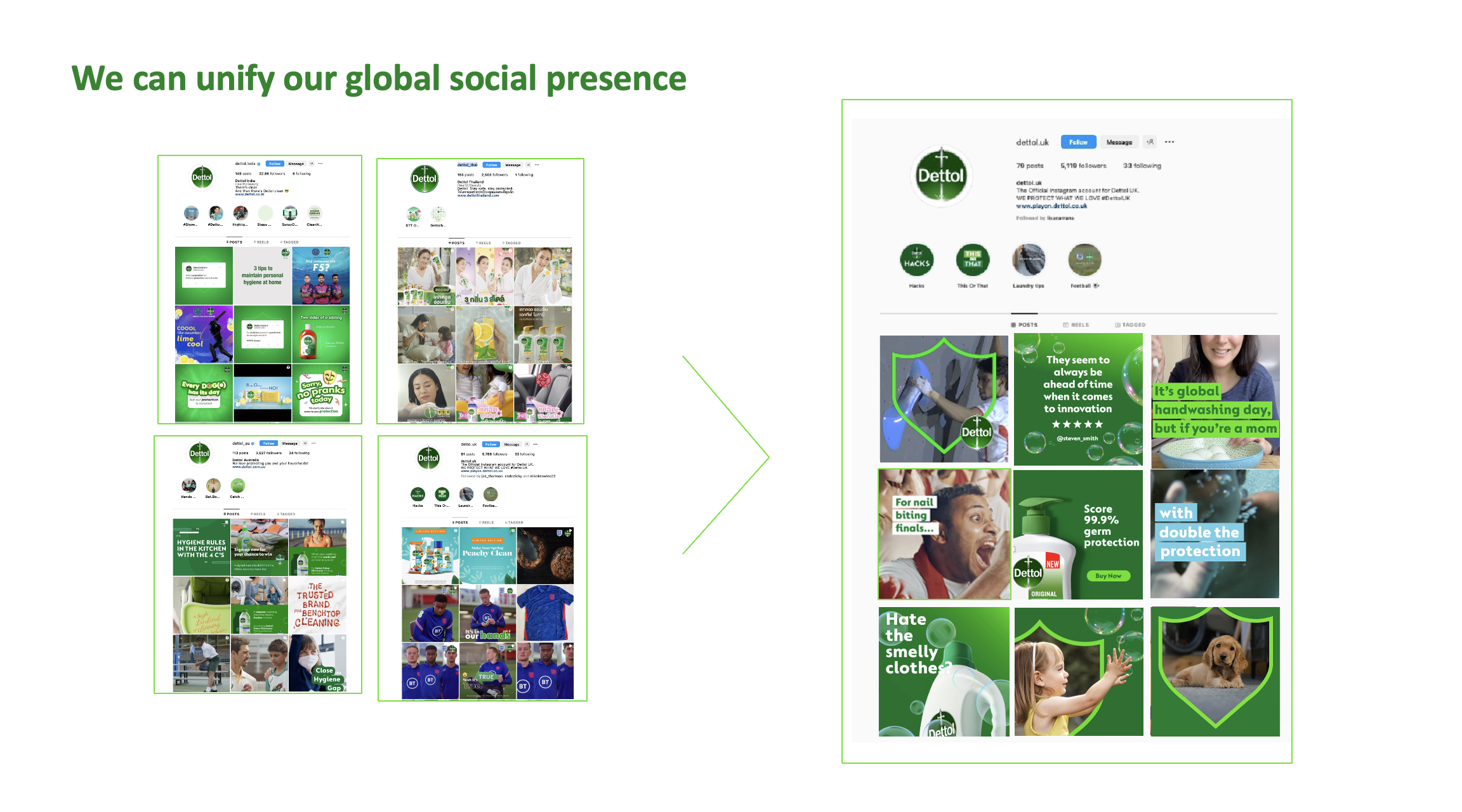 Dettol was a disjointed brand worldwide. Through research we identified and created supporting brand assets to enhance a wide portfolio with global nuances. Inspired by the duality of the brand promise we redesigned the brand look and feel and tone of voice across brand comms, social and e-commerce. Throughout the process we worked with regions, to take them on this global brand restructure, ensuring it worked in both developed and developing markets. After our launch we continued to steward and govern markets, ensuring brand unity across the world.